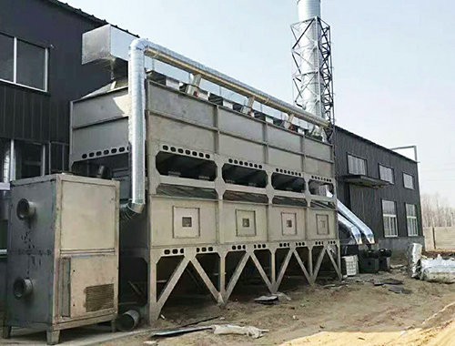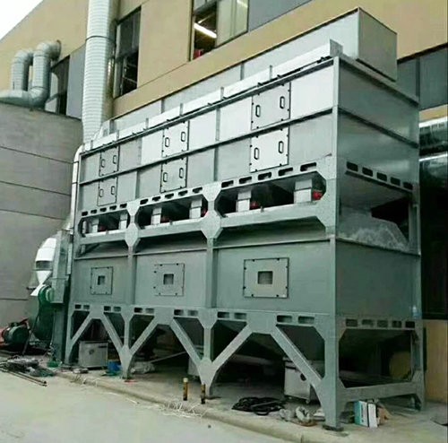 在化学反应过程中,利用催化剂降低燃烧温度,加速有毒有害气体完全氧化的方法,叫做催化燃烧法。由于催化剂的载体是由多孔材料制作的,具有较大的比表面积和合适的孔径,当加热到300~450℃的有机气体通过催化层时,氧和有机气体被吸附在多孔材料表层的催化剂上,增加了氧和有机气体接触碰撞的机会,提高了活性,使有机气体与氧产生剧烈的化学反应而生成CO2和H2O,同时产生热量,从而使得有机气体变成无毒无害气体。